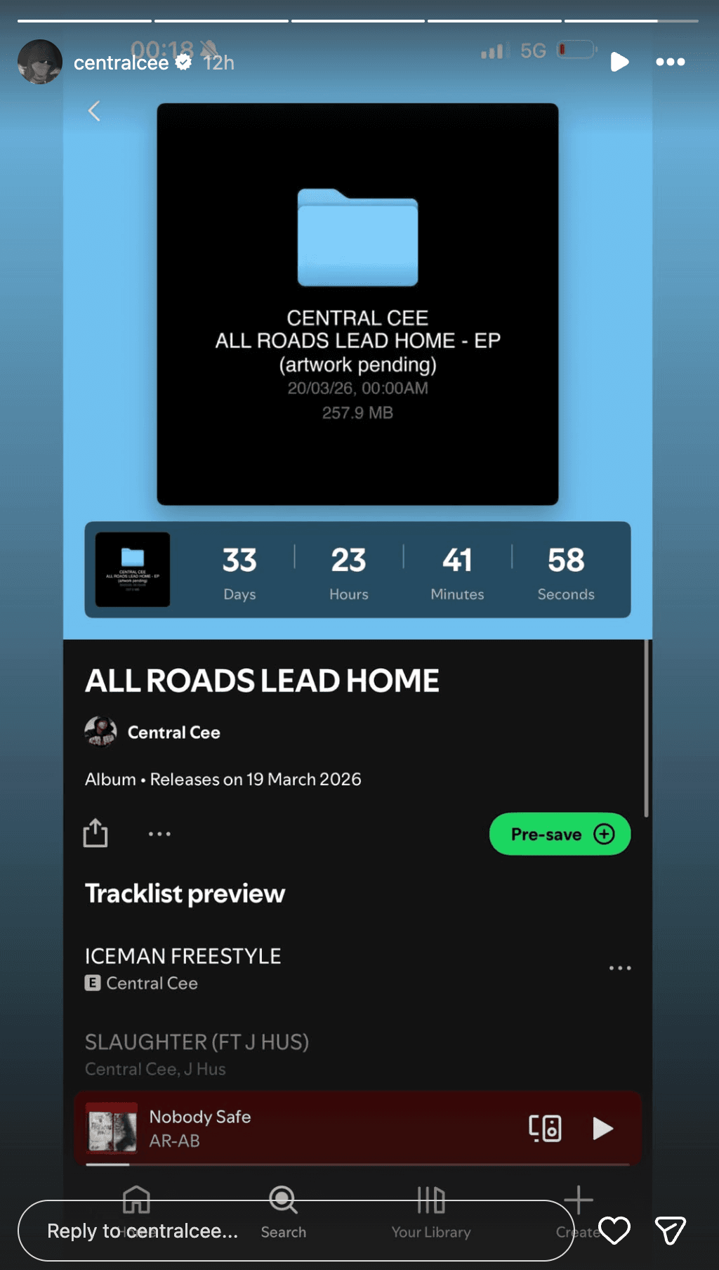 Den britiske rapstjerne har netop delt en story med et simpelt screenshot af en nedtæller sat til 33 dage, ledsaget af titlen “ALL ROADS LEAD HOME”. Ifølge billedet består projektet af 7 tracks, og det eneste konkrete navn på tracklisten er en feature fra J Hus.